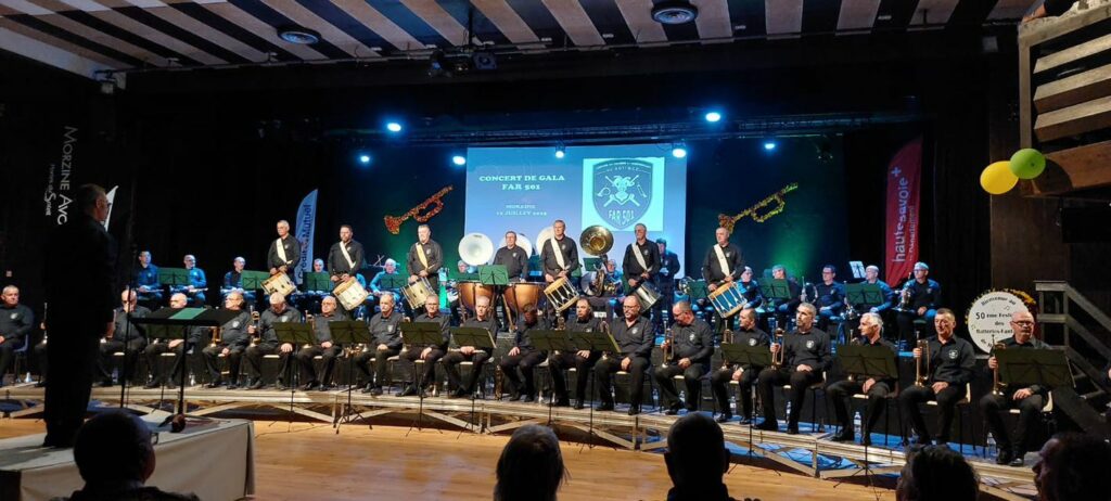 En cette veille du 14 juillet 2025, la FAR 501, invitée à participer au 50e festival des Batteries-fanfares de Haute-Savoie par « l’Edelweiss de Morzine », marchait également dans les pas du Major Souplet, qui en Juillet 1989 dirigeait son concert d’adieux au Palais des Sports de la ville.